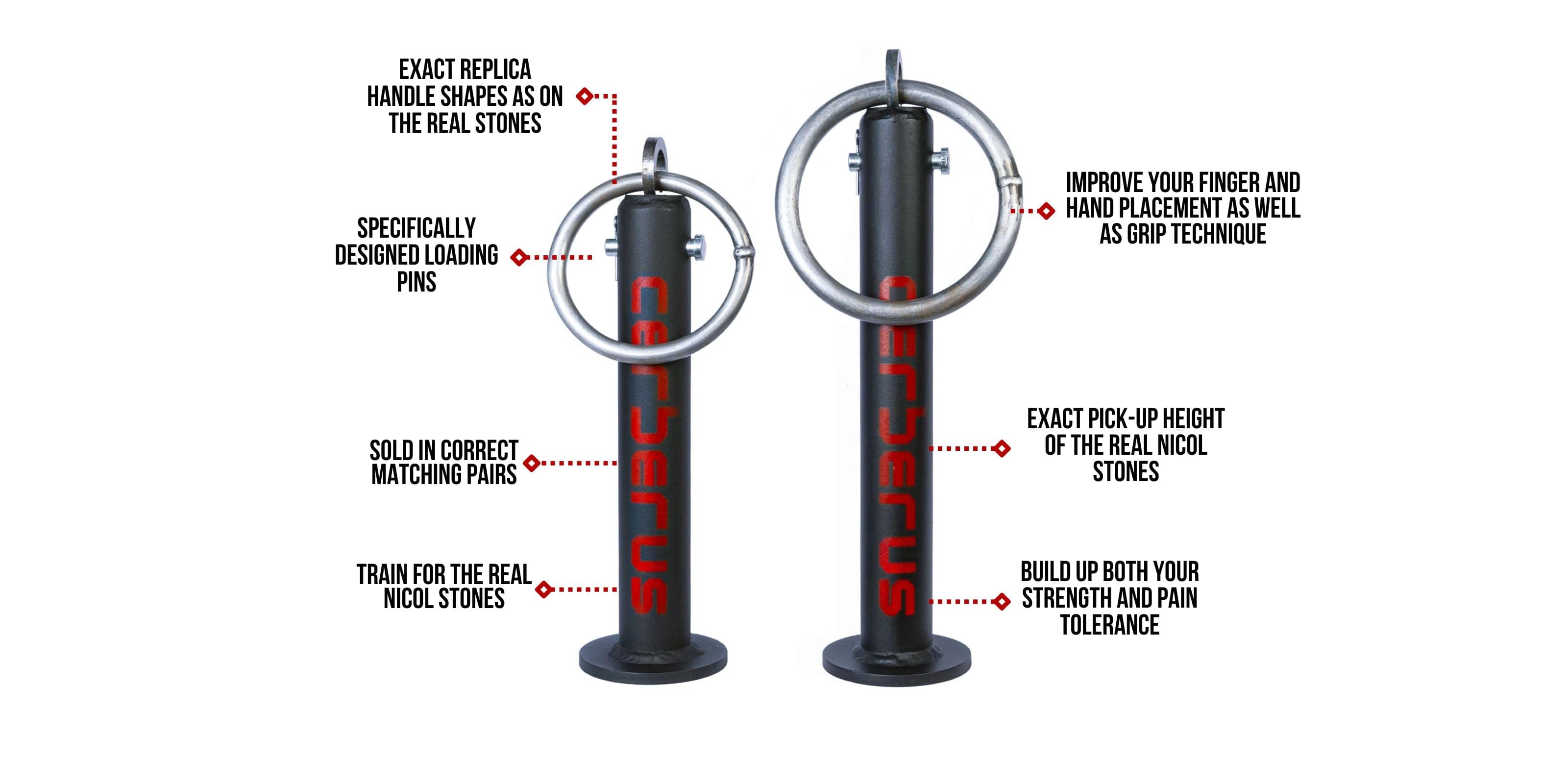 CERBERUS Nicol Walking Stone Handles are the official replicas of the ring handles and pick-up heights of the real Nicol Walking Stones. They are not just standard circular shapes they have been made as close as possible to the two different handle shapes on the real stones. They will allow you to build up both your strength and pain tolerance. You will also be able to practice and improve your finger and hand placement as well as grip technique. Because these come with specifically designed loading pins you also get the correct pick up. You can improve your lift and perfect your technique! Our handles will get you ready for this epic challenge and let you train like the pros!